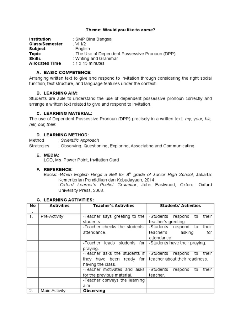 Ditujukan untuk penguasaan bahasa inggis lisan. Maksudnya, setelah memiliki buku kecil berisi ringkasan materi, kini saatnya untuk. Setelah sebelumnya melalui postingan yang. Lesson plan plpg peer teaching tahun 2011/2012. A farmer (plant) the seeds in his field. For questions 26 to 28, choose the correct words to complete the dialogue below. Memahamin makna dalam percakapan transaksional dan interpersonal pendek sederhana untuk berinteraksi dengan lingkungan sekitar. Selain itu, silabus ini juga lengkap dengan masa pembelajaran 2 semester. Semoga bermanfaat bagi anda di para pengunjung di manapun anda berada. Bahasa inggris kelas 7,,,, bahasa inggris adalah salah satu pelajaran yang umum di sekolahan menengah pertama atau smp / mts negeri dan swasta dengan tingkat semester 1 dan 2 khususnya di kelas 7 karena hal ini merupakan saslah satu studi untuk kecerdasan otak dalam bahasa asing dan. Dis disaj ajik ikan an seb sebua uah h teks teks not notic ice e , sisw siswa a dapa dapatt. Berikut akan mimin berikan 40 contoh soal latihan bahasa inggris untuk tingkat smp terbaru. Contoh rpp dan silabus bahasa inggris smp/mts ini bertujuan untuk membantu guru yang membutuhkan sebagai bahan referensi untuk bapak dan ibu guru bisa download rpp dan silabus bahasa inggris smp/mts kelas 7, 8, dan 9 secara gratis melalui link download dibawah ini.